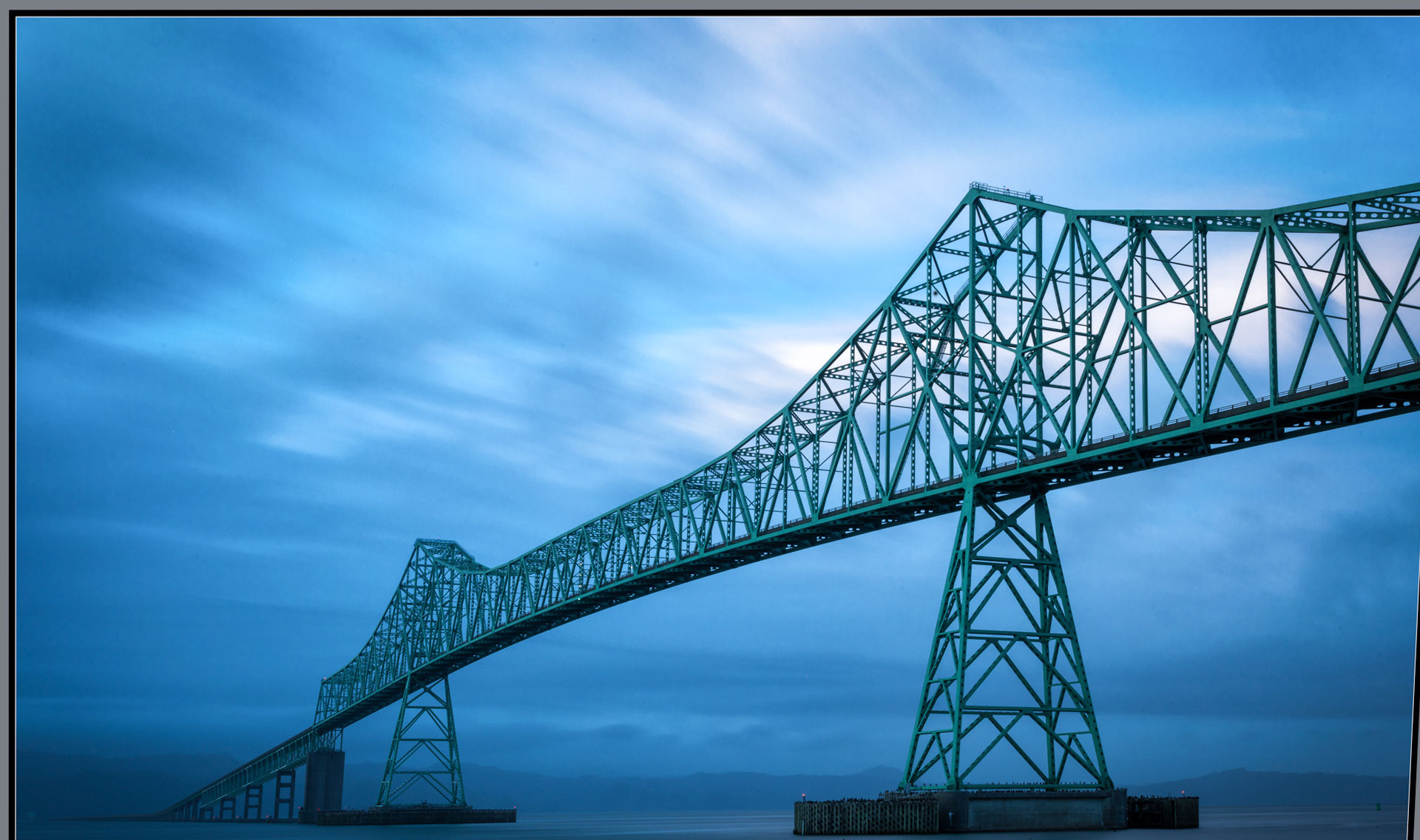 This is a moody shot, just what one envisions of the rainy northwest. The colors make the mood and the bridge is a great foreground element. As noted by Bill and Abe the bridge is the dominant feature and the sky is secondary, while your title has the sky as primary. I took it into Lightroom and cropped the bottom some to see if that focuses more attention on the sky. I also corrected the horizon line. The result is below. I also liked the frame around the image, it adds to the mood. |