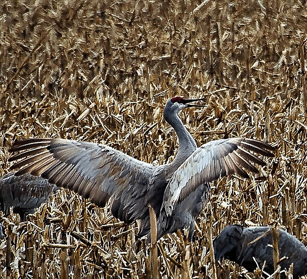 This is an interesting image but looks flat to me. I would add some contrast to the cranes and darken the plants to provide some more separation. I tried this and also cropped down to one big bird. See thumbnail. Did not work to well with a jpg image but if you have the RAW file, it should turn out better. Also, would need to make the same adjustments to the 2 little birds in the image. |