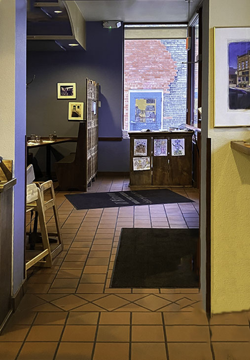 I debated about leaving the wine rack in or not, and decided to leave it in because it is a restaurant. I think it is better with it removed. I also wonder if you went back to the original and enlarged the canvas on the top to give it more wall then do the guided transform so there is wall above the door. Another way would be to try generative AI in LR and ask it to add wall above the door and see what you get. |