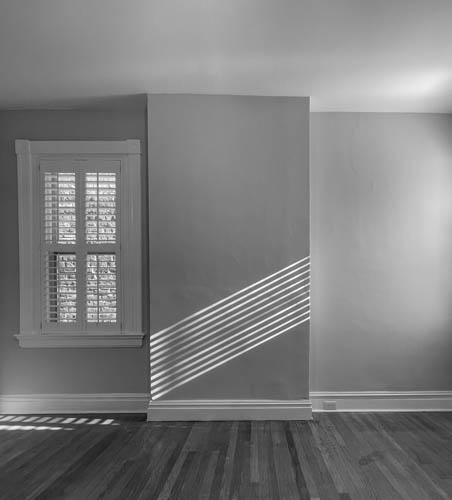 Great abstract shot. The tonal range is good and B&W is definitely the best choice. I would crop a bit to focus the viewers eye to the abstract features crated by the light (see thumbnail). I also wonder if the outside as seen through the window should be darkened or blurred a little. |