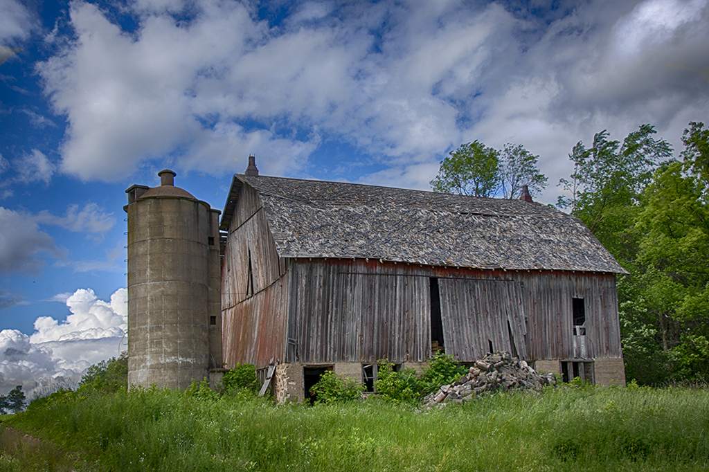 I added -14 black and +14 white using ACR to make the blacks black and the whites white. I also did a little perspective correction as the barn and silo seemed to be receding a little. |