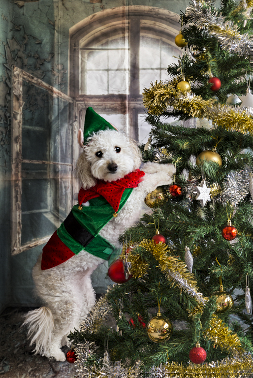oooh, love this! the dogs outfit and expression and the tree, love it!