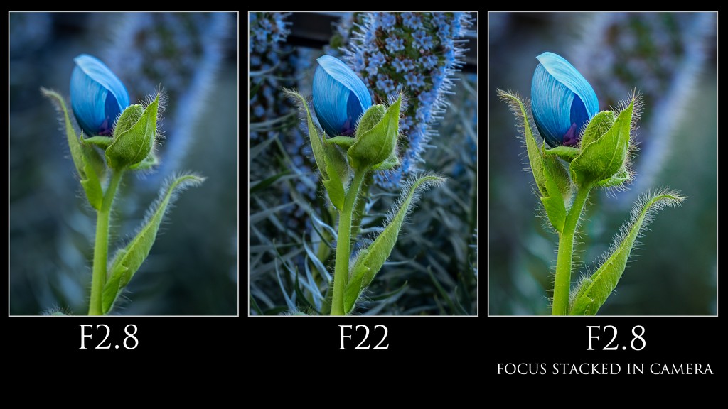 Olympus is unique in that it stacks in camera. For me it is liberating, as much as I like post-processing there are just not enough hours in the day. I can do this handheld, with a tripod, or with a flash (The Olympus flashes sync and will recycle in sync with the exposures, non-olympus flashes have a lag and you can set the recycle lag time but it would be hard to do handheld).
