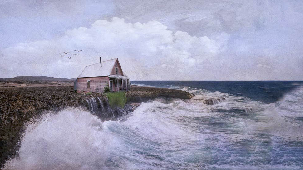 Wow, Kathy, this is stunning! I love the house on the edge like that and the muted colors and the clouds and the birds, wow!