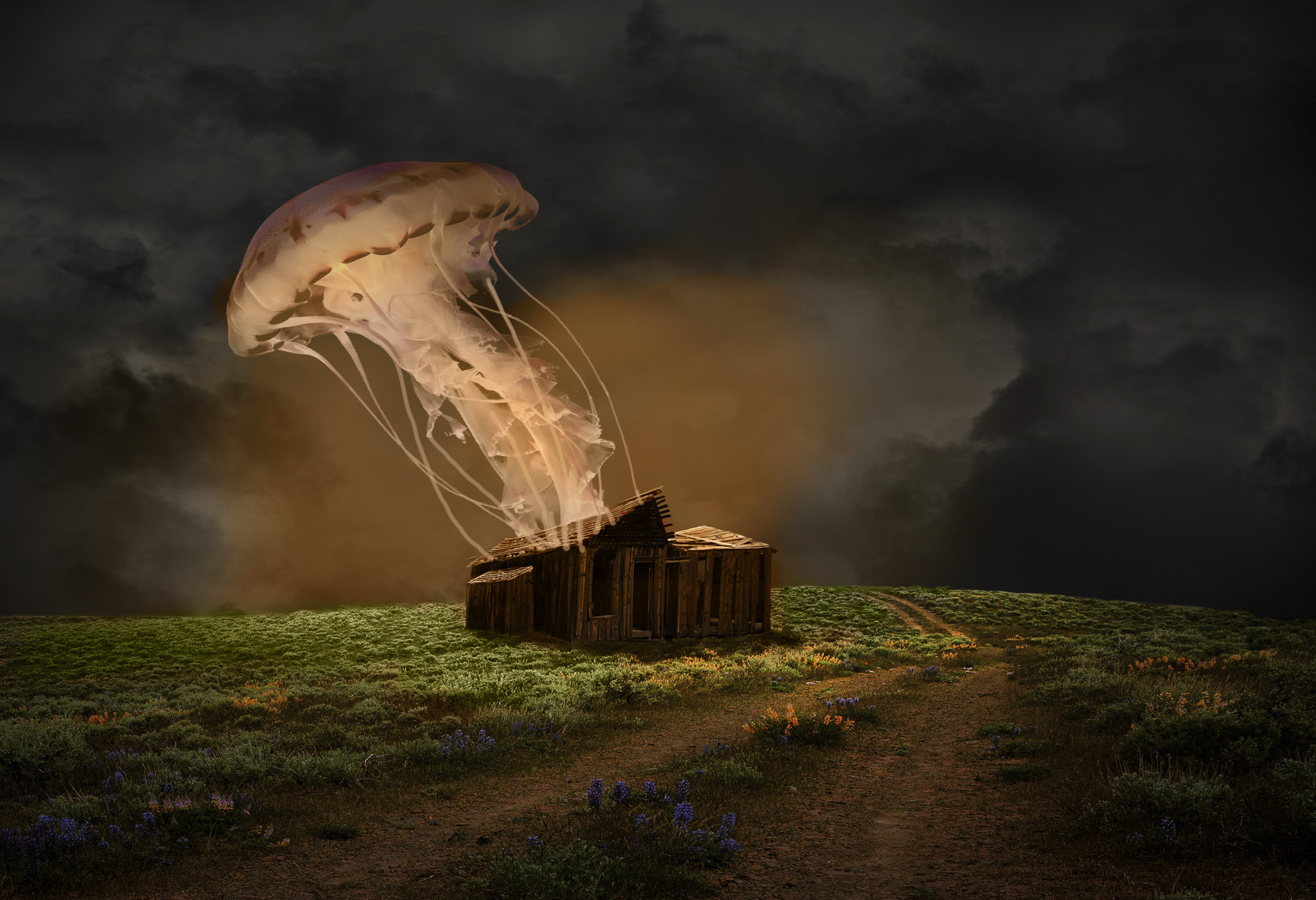 The road and flowers are well composited. And you changed the sky (clouds) too. The darkened down image has a lot of moodiness which matches the fate against the jellyfish