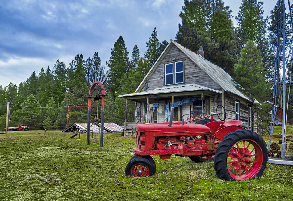 I like the composition coming in on the left with the far red truck and then coming to the house and then to the awesome red tractor.