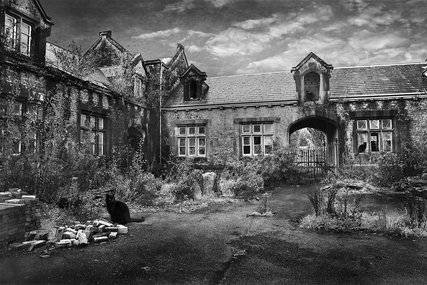 The building looks great in black and white, good subject. Adding the cat makes the image have more of a story. I like the placement of the cat and it looking into the frame.