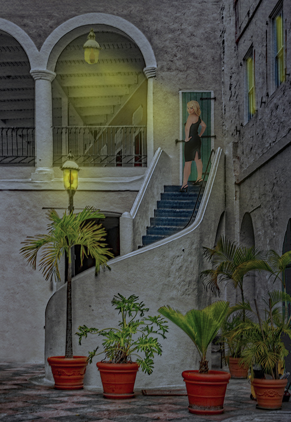 The white dot pixels around the model are the largest giveaway that she was pasted in from another scene. |