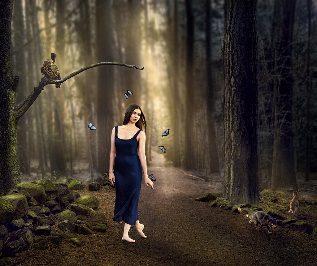 I love the warm light rays coming through the forest. The concept of the woman and the animals with the fluttering butterflies is wonderful. I like how you changed the woman's dress blue to match the butterflies!