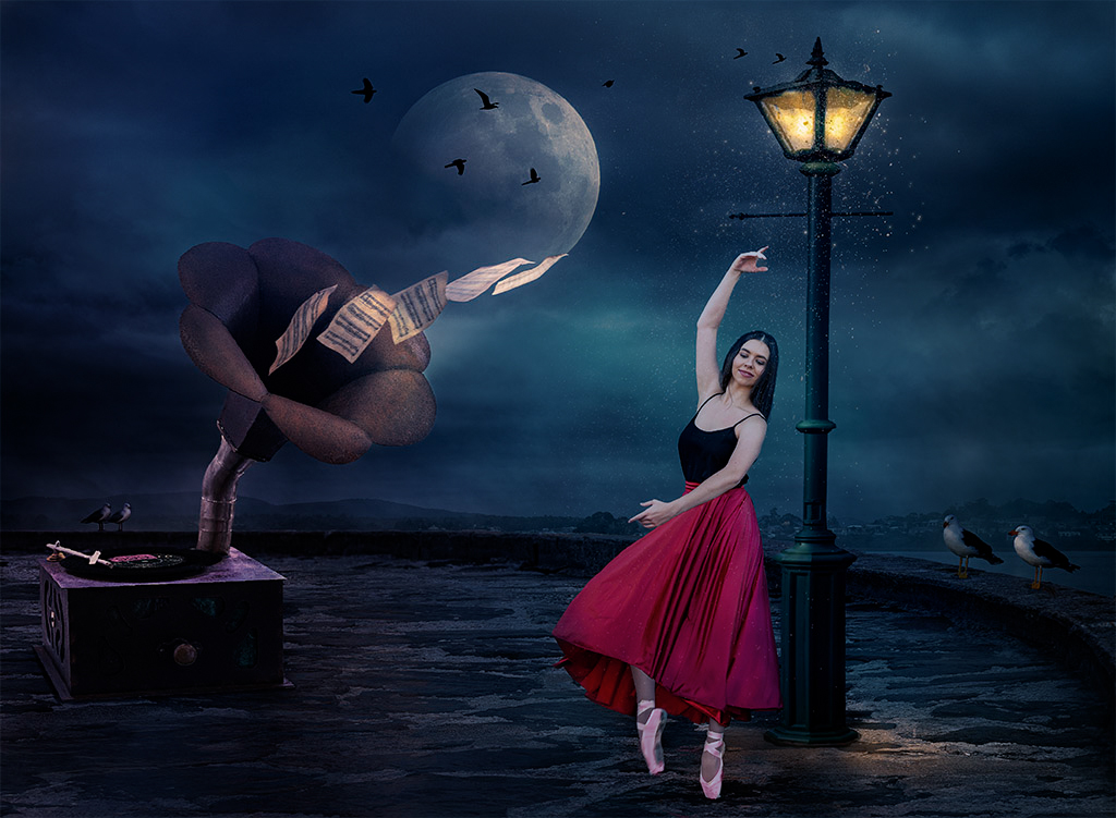 I like the story and composite elements. The lue toning and the music sheets and the moon all work for me. Even the "audience" with the two pairs of gulls far and near, watching like spectators or fans, works.