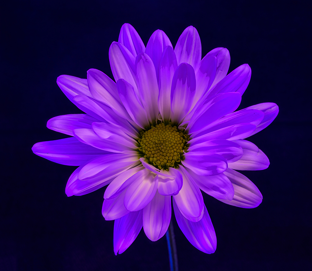Alan - I saw some Images on the computer that were done under black light conditions. I am still playing around quite a bit and this was a first try. I used a black backdrop with 3 black light lighting sets. 2 on the sides and one overhead. I did find out that the exposure time had a tendency to change color of the whites. Shorter time 1 second gave out a beautiful pink/purple hue to the lily. I also played with daisies. Same results - 1 second was pink/purple, 2 seconds was a combination of pink/purple start to see some blues and 4 seconds changed the white colors to a blue with yellow center turning to a green color. Attached is a daisy at about 2 seconds. |