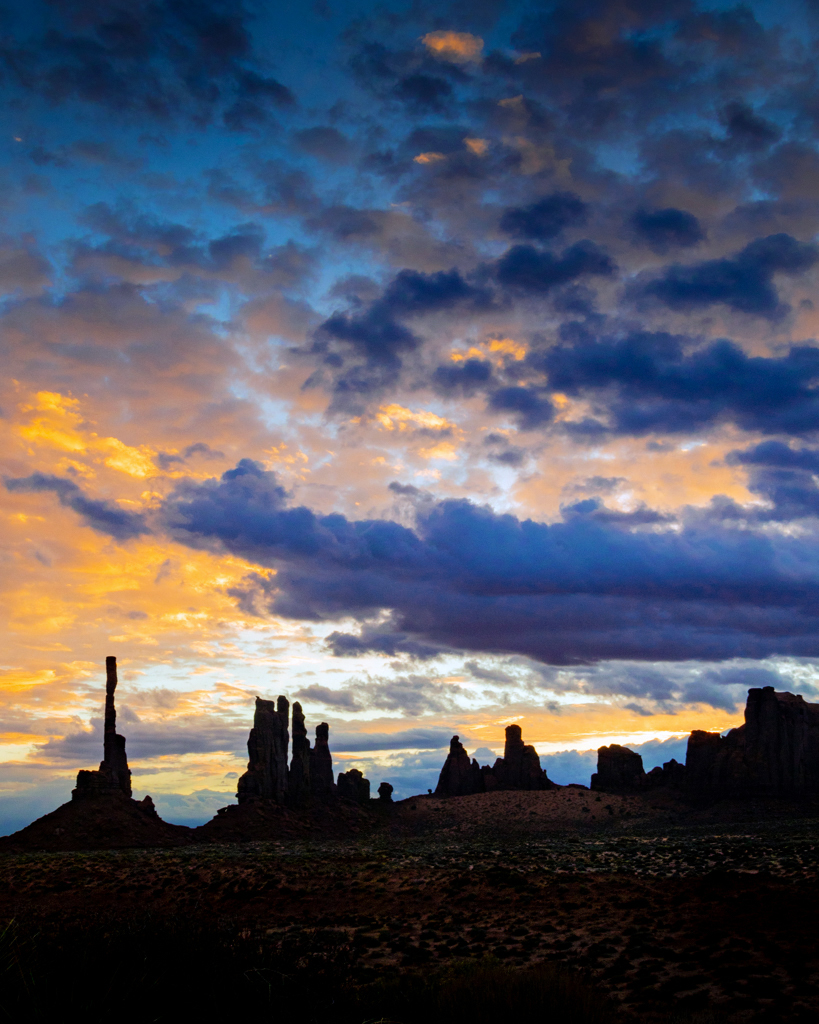 I like this image. To my eye I thought the foreground could use a little lightening as the center shows a hint of detail in the ground. I lightened it a bit and darkened the monuments to add to the silhouette scenario. I might have darkened the lower clouds a bit too much though. You need to play. Your thoughts? I think you have to open the image to fulls screen to see my changes. |