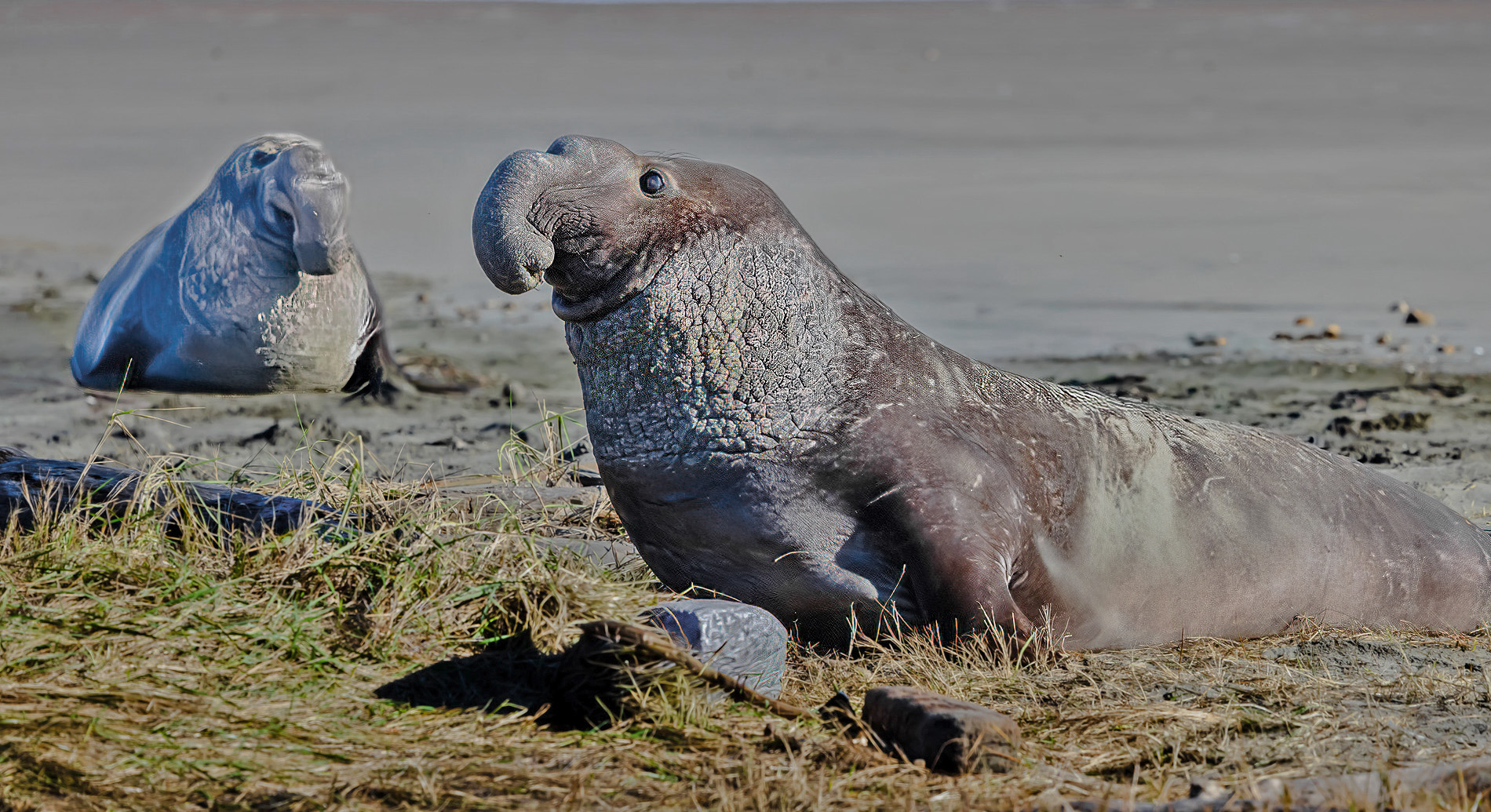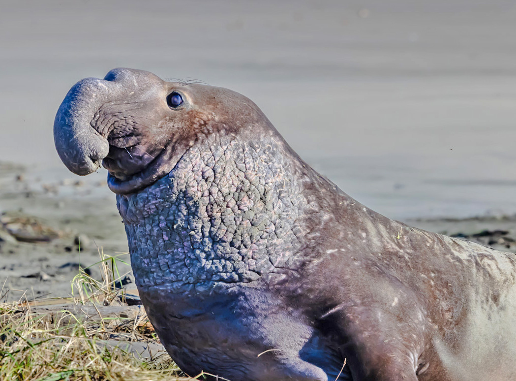 Such an ugly but beautiful creature. I am sort of torn between some of the suggestions of the others. Since the background seal is so out of focus it makes sense to me to crop it out. I took it a step beyond and cropped the bottom up quite a bit to just above the rock and also the back 1/3 of the seal. I also lightened the shadows on the chest a bit. I think by cropping something like this you retain the massiveness of the seal, show it's many battle scars and have great detail in the head area showing the eye, whiskers and the hair on the forehead. |