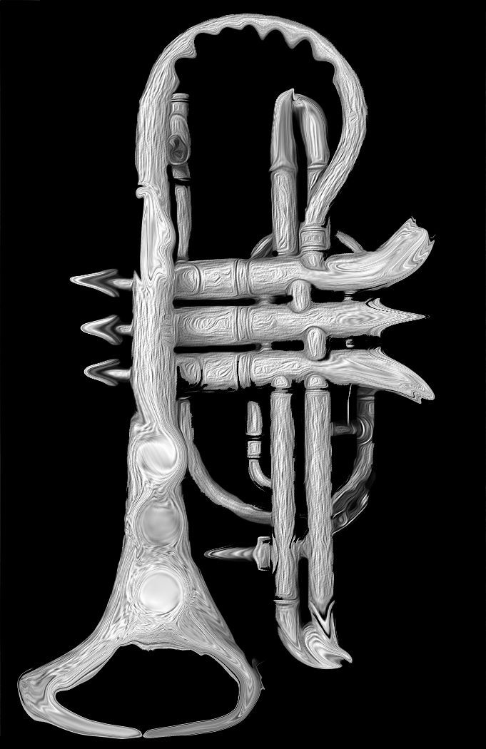 For my taste, the alien trumpet looks too much like a domestic trumpet. I took the liberty of using the Liquify Filter on your trumpet for a couple of minutes to see what havoc I could wreak. The Liquify Filter has a moderately steep learning curve, but the effort can be worth it. I'm still learning which is obvious from my rendition of the trumpet. |