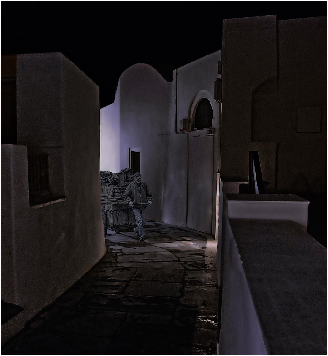 Steve, thank you for taking time to edit my composite. The light lines come from lights seen and unseen. The buildings were not cut out and added to a night sky. The man and his cart were the only things added to the scene. I always forget to add a stroke, even in my camera club competitions. I think the synapse for that necessity has eroded. |