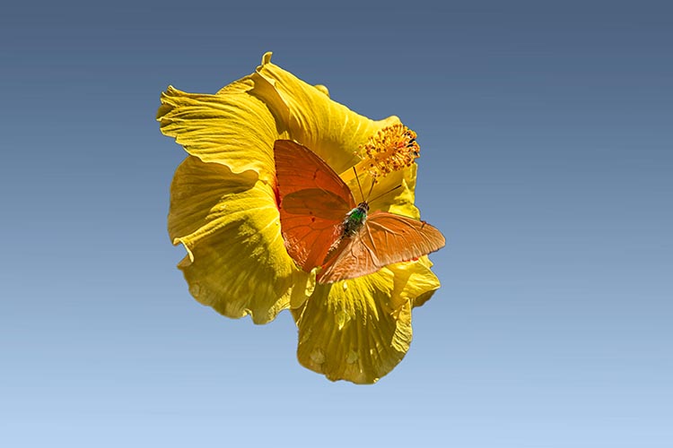 Thank you for your workflow. It's always beneficial to get into the mind of another photographer. As I have said on occasion, I'm a proponent of K.I.S.S. I extracted the flower and butterfly and changed the hue of the butterfly to give it some separation from the flower. I feel the background detracts from your lovely shot of the flower and butterfly. I chose the blue background (1) because it's simple and (2) I have it in my background folder. |