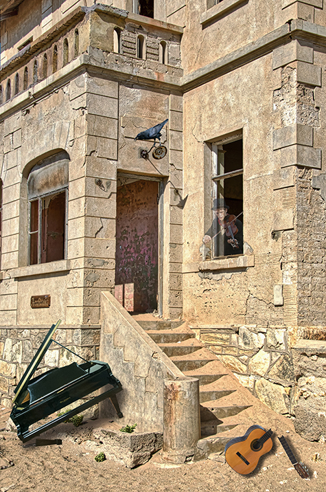 I could alter the opacity of the violinist to make him more visible, but the overall image is more balanced with him in the window on the viewer's right. The building is in a ghost town outside of the town of Kolmanskop, Nigeria, a short distance from the port city of Luderitz. |