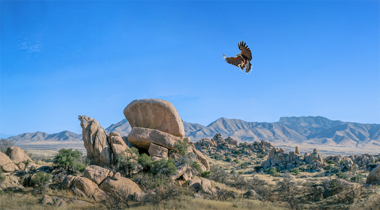 You have captured the beauty of the landscape so well that anyone looking at this image would immediately want to walk among the boulders. I have a couple of suggestions that could possibly focus an observer even more. I try to use a "less is more" approach to my composites. I don't always succeed, but I try. I removed most of the clouds and moved the hawk so it is not cut in half by the mountains and so its descent onto the boulder is more dramatic. I also cropped the right side of the image to address the horizontal question you had. You have the makings of a good image here. Nice work. |