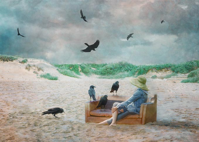 The texture is so wonderful in this composite that I hope you can elaborate a bit on just how you achieved it. The girl on the couch is much more powerful than the soft image she portrays. She's a terrific choice for the couch. I don't know if you are familiar with the Alfred Hitchcock movie "The Birds," but you're dangerously close to duplicating his theme by placing too many birds and losing the soft effect of your image. I've taken the liberty of editing out some of the birds, moving the one in the sand, and cropping the image a bit. You have a terrific artist's proof here worth tinkering with a bit. |