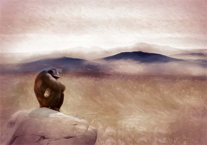 I agree with Kirsti that the background is beautiful, but I can't help but feel that this same background doesn't fit the title or the "desolate" (Kirsti's word) mood of the chimp. I also feel that the lizard is unnecessary. I took the liberty of editing your image to make it more "desolate" and more in keeping with your title. |