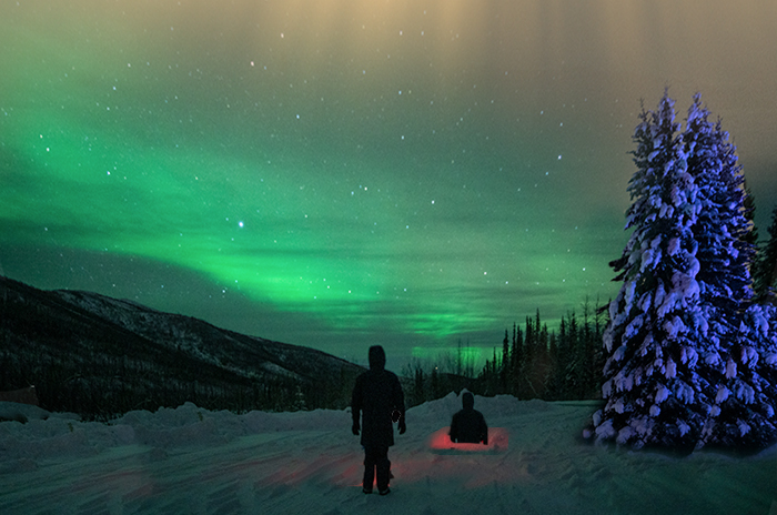 Obviously, there's a lot of food for thought, here. I think the bumper sticker philosophy for this composite is "If it ain't broke . . . ." The colors are masterfully blended as usual and fit the scene perfectly. The snow covering throughout the image, including on the trees, communicates COLD very well. In spite of the bumper sticker adage, there are a couple of (rough) changes I took the liberty of making. I straightened the trees and moved the red hole so a figure could emerge from it. I went for the mysterious by adding the second figure. The basic original composite works well as a backdrop for future musings. |