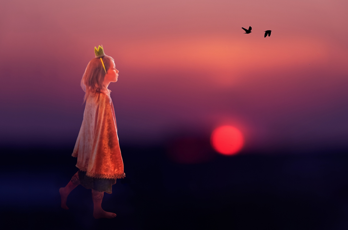 What a provocative image. Everyone who sees this will see something different. The colors are terrific because (1) they are a bit other-worldly, and (2) they seem to support the princess as if she is floating. There is a theory of thirds in creating images that says that the focal point should be at one-third of the "canvas." I'm not shy about breaking rules, but in this case, you have placed the princess at what seems like the one-third point, and it's quite powerful. As I am a "less is more" disciple, I would make 2 changes. The scepter seems to be in an awkward position even though she is sleepwalking. I am also distracted by so many birds. The 2 main birds are strong enough to make the point. I've taken the liberty to attach an image with those changes. Provocative images are especially stimulating. |