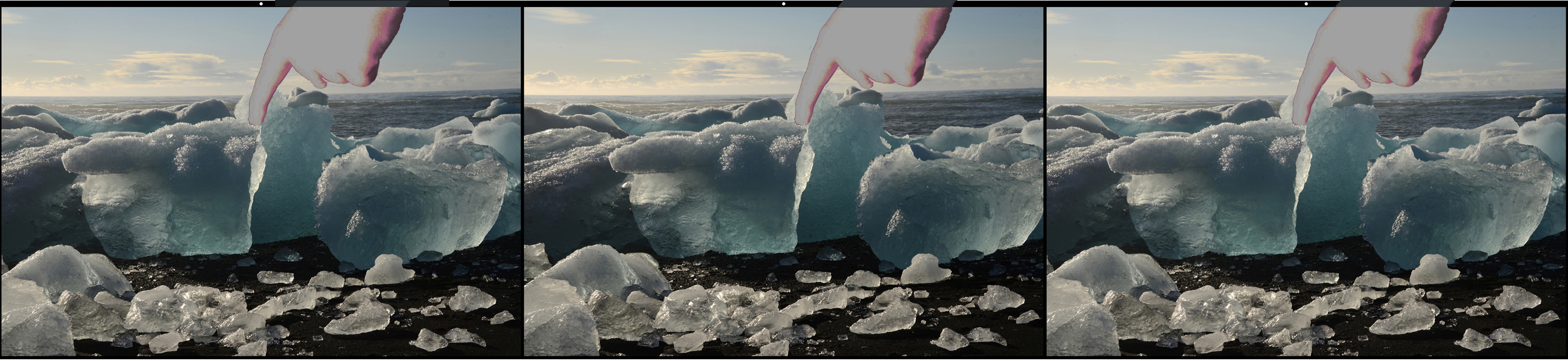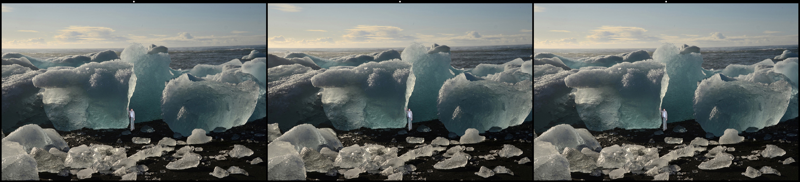 It is an intriguing image. As I look at the image, the blue ice burgs could be 30 feet tall with a little man standing at the base or 6 inches tall with a finger pointing at the biggest one. I have to assume the latter, but one can't tell. I'll upload a couple examples. |