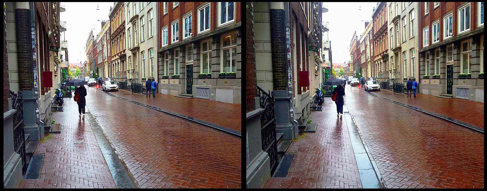 Looks like fun traveling and taking images of foreign places. It must have been a real overcast day or the image was a bit over exposed. I can't see much of the buildings roofs next to the sky or the detail of the distant street. I tried to enhance the color and contrast some, but it still looked like a "Rainy street in Amsterdam". |