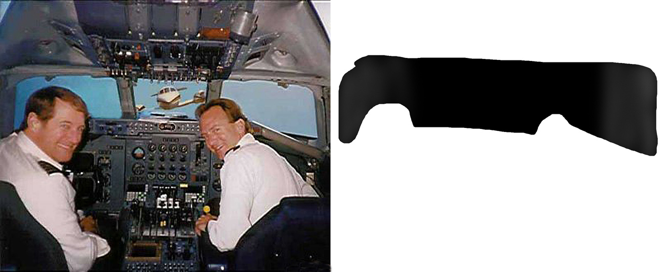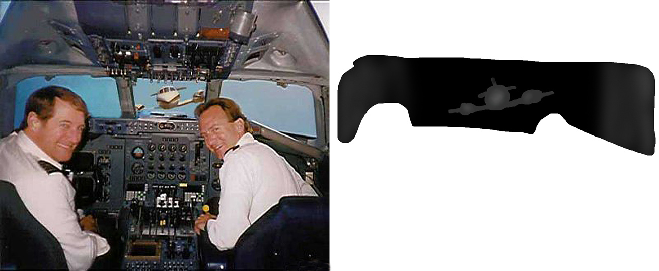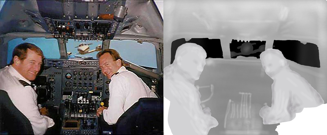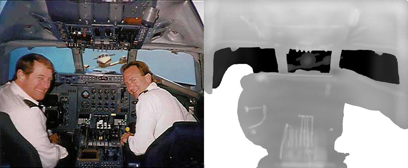 Here are 6 small images in my process. 1st, I made a double size image with the right side all white. 2nd, I made a layer in PS of the back of the window and poured it black and then moved that layer over on the right in the correct place. 3rd, I made a layer in PS of the oncoming plane, poured it in less black and moved it to the correct place. 4th, I made a layer of all the inside of the cockpit and poured it in gray and moved it to the right in the correct place. I added some whiter places to bring those things a little forward. 5th I made a layer of the piolets and poured it in almost white and moved them over to correct place. 6th I made layers of the seat backs and made them white and moved them over to the right side. In order to know where each of these moved layers needed to be I made a layer of the right side and made it about 20% opaque and moved that opaque layer over to the right to show where each of the new layers needed to be. I modified many of the layers, like the piolets faces ETC to give them contours. It took some time, but what else do I do when I have to stay home all day. |