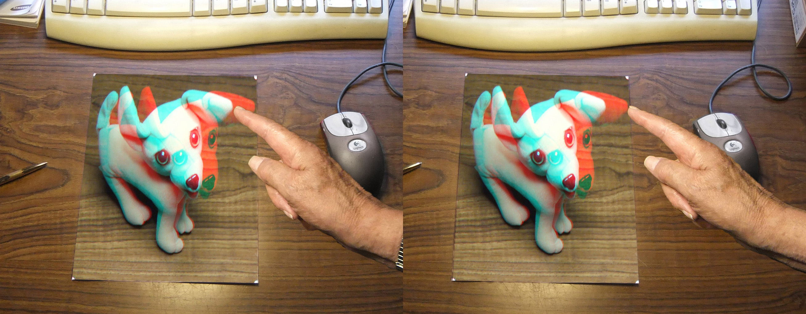 Thanks for the comment. Our 3D club did some large 4' X 8' anaglyph images for the state fair and the company that printed them for us had just the right color of red. There was NO ghosting with the regular anaglyph glasses. Like I said my printer doesn't make good anaglyph phantograms. I kind of wish I had placed my hand in the normal side by side image, pointing just the right height, so when it was viewed without anaglyph glasses, it looked like just a paper on the desk and then when viewed with anaglyph glasses my finger would be pointing right at the dog's head. |