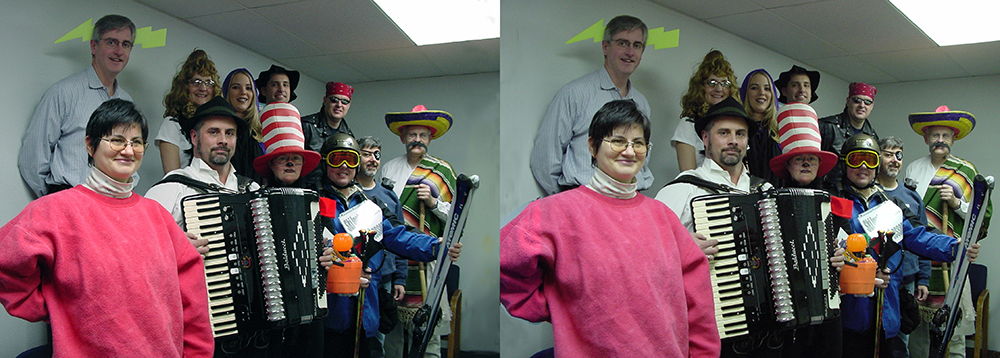 No, the Boss was OK with it. We had a Halloween party and here we all are. Boss with lightning bolt in head, the guy in a crumply black hat and the one in a red head scarf did the office prank. You can see me as Poncho Via in Mexican hat. |