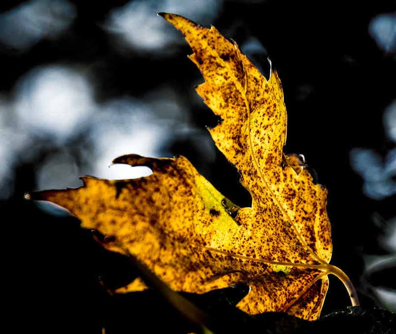 The bold yellow of the leaf makes a good contrast to the rest of the image. I like the shape of the leaf that allows the sky to come in through a triangular shape on the left. I cropped the largest left white cloud and lowered the vibrance on the others. I think it softened them, and took away the blue cast. That let me focus more on the leaf. |