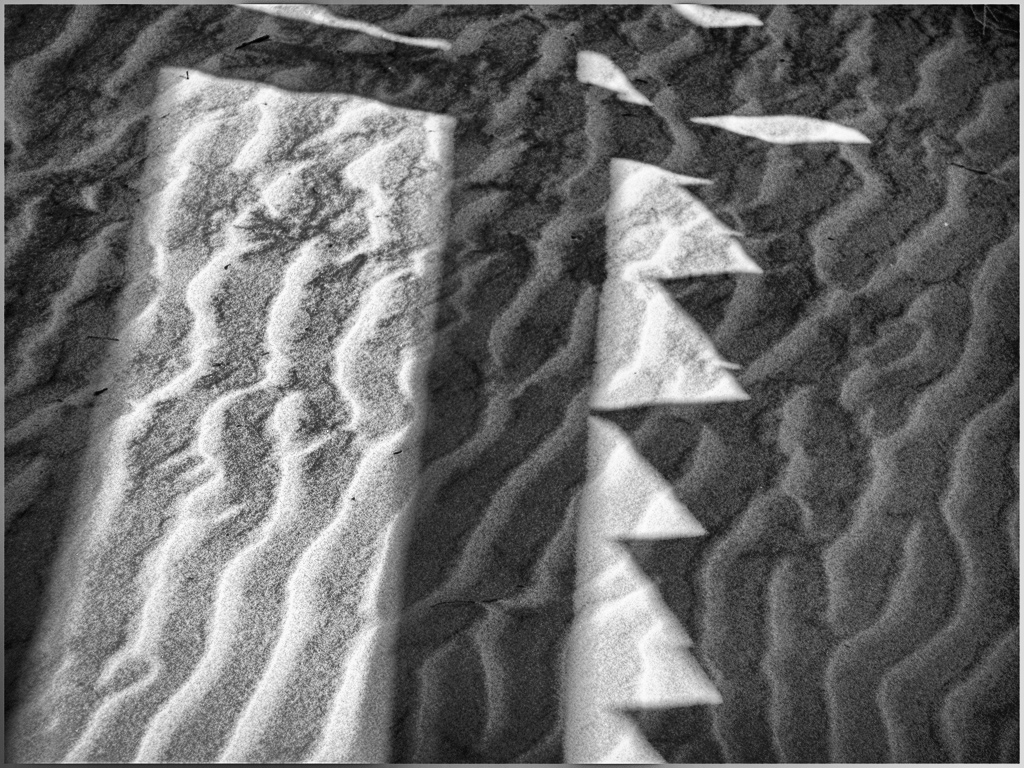 The ripples in the sand and overlay of bold lines of the strong shadows are fascinating to me. Larry's version of a monochrome is a good one, I think. I also gave it a try. See what you think.
