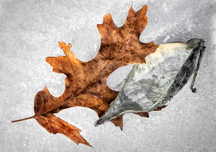 Nice image, Janet. I like the image flipped which to me makes the composition a little better. I feel the stem of the leaf with it flipped makes a good lead in line to the image and improves the composition. Added about 45% structure to help bring out the texture in the snow. Also darkened the lightest area of the snow a bit. Nice image. |