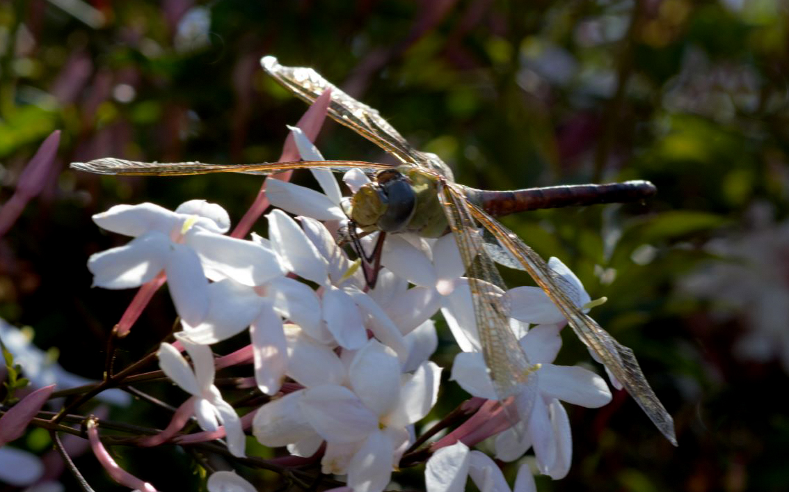 area which is a distraction. There are a lot of hot spots due to the full sunshine. It is best to shoot a subject like this on an overcast day or use a fill flash so there's better lighting on the dragonfly. The bright contrast of the white flowers makes it hard to appreciate the dragonfly. I did crop the image to try to eliminate some of the area on the right. Maybe some of the other group members will have some ideas.