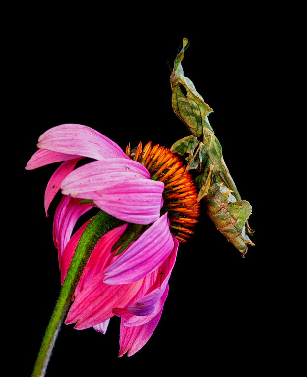Hi Tracy. Very interesting mantis for sure. We don't have those kind that I know of in our area. I agree with the flip Janet made. Love the composition with the flip. The entire image is over exposed by about a half stop. I looked at the histogram and the pinks are blown out. This means when something is blown out this information is lost. You can't really fix it. I pulled the exposure back but really can't do much for the top two petals. I also darkened the background to make true black. When your doing a set up like this it easy to take a shot then look at your histogram and make adjustments to get the exposure right. It easy to blow things out when using a black background. The meter in the camera will see the background and try to make the black gray 18% and at the same time over expose your subject. You had a great set up to work with. |