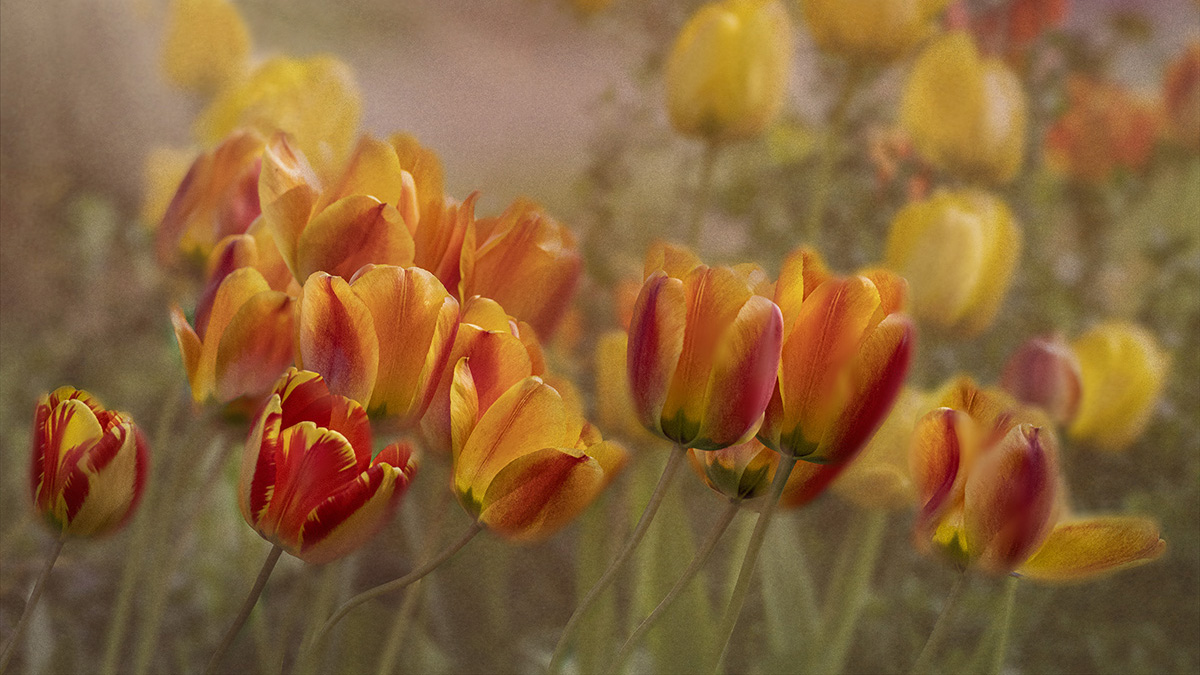 Hi Fran, I love your tulips and like the way they are leaning to the right. This adds a nice diagonal line to the composition of the image. I like your added sun rays. I agree with Melanie about a crop. I like the tulip on the right with one petal on a right angle, so I left it in on my crop. I did crop down from the top and removed the one green stem from one of the cropped tulips. I do like the texture you added. |