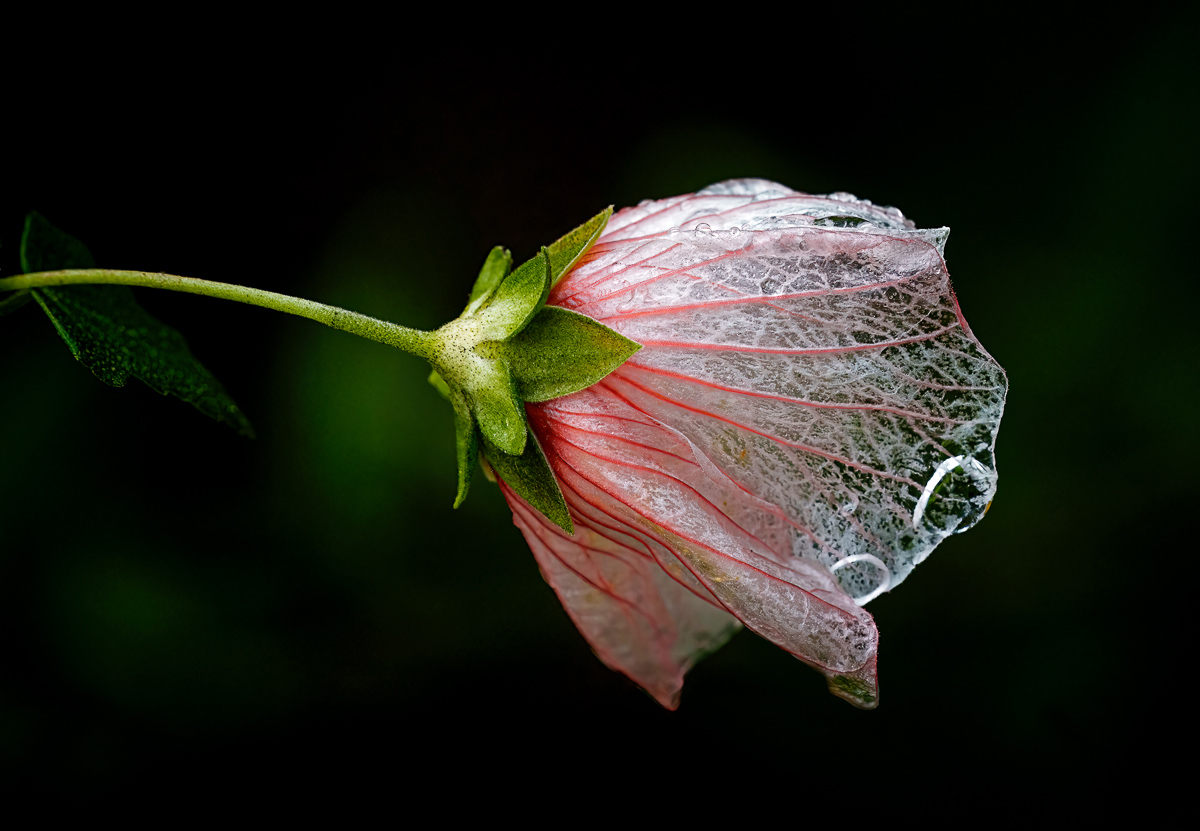 This is a beautiful image, Maria. I believe this is Rose Mellow it's in the Hibiscus family of plants. It has very delicate petals. Beautiful detail in the petals, look like lace and even more so when wet. Love the background with a hint of green. Great lighting on the flower with the background going dark makes the flower stand out giving great impact to the image. What was the lighting?