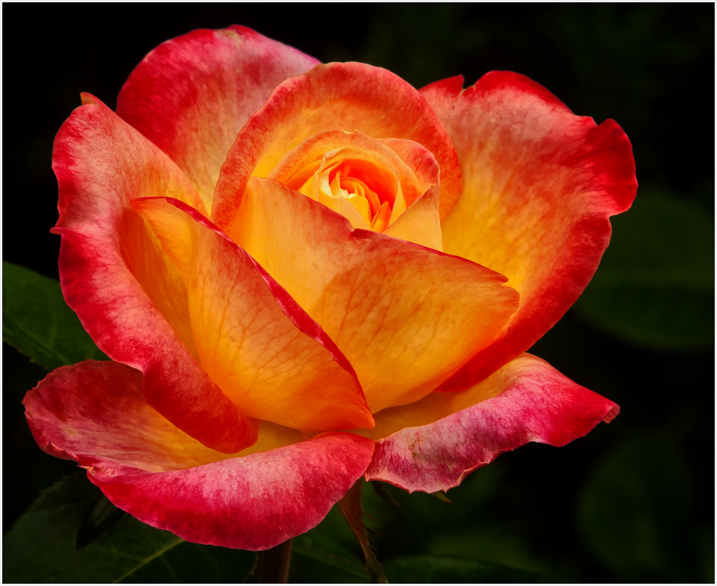 Nice image of a rose. Good detail in the petals. Good to see you used a tripod which would allow you to use a smaller aperture and gain more DOF on the petals. Love the darker background with the darkened leaves. I think your composition is good with the bud in the upper right on a nice diagonal. I would not flip the image. Great lighting. |