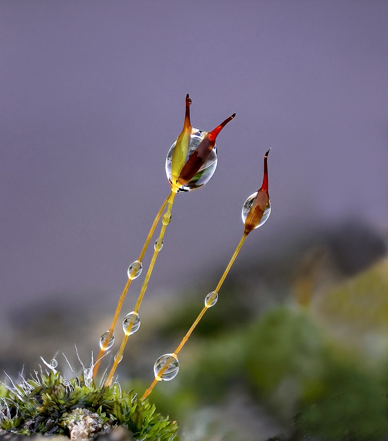 This is an outstanding shot with such great detail in the image. The drops are very sharp with great detail. Love the detail in the moss at the base with the white tuffs really add to the image. You sure have a great eye to see this shot. Hope you don't mind I did a crop and flipped the image and removed some distractions. A really great image. |