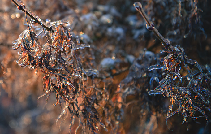 I like the colors, and capturing ice covered foliage is not an easy task. The bokeh in the background is a nice side effect of the lighting. I hope you don't mind that I cropped, (it may be too heavy of a crop), played with the levels a little, and sharpened just a tad in ps. The original image is nice, but there is a lot of information there that is out of focus, and the main subject almost gets lost in the background. Wonderful lighting tho. Hope this gives you ideas. |
