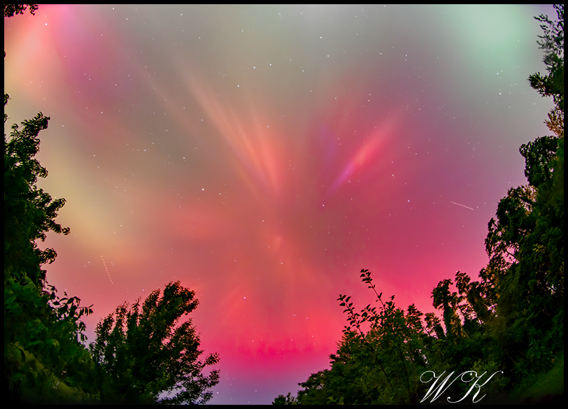 Thanks for your comments!! Kathy, here are the camera settings: Shot with the D800E camera, using the inexpensive Rokinon fisheye 8mm lens (It's the only lens I have that will expose the entire open sky in my yard, from one group of forest trees to the other, otherwise I have to end up stitching together images, but it does have a high distortion curve as you can see by the curved car lights). F 3.5, 15 sec. ISO 1000 and -0.5 exposure comp., pattern metering, on tripod and no flash. Hope this helps. The car lights at the bottom, going past on the road was just a lucky accident. I intended to take a picture of the northern lights above my neighbor's house, which is across the road. When I brought this image up on the computer, I was amazed to discover that the lights were a different color in that direction (which is a westerly, NW direction.Here is an image from more directly overhead from the same shoot. |