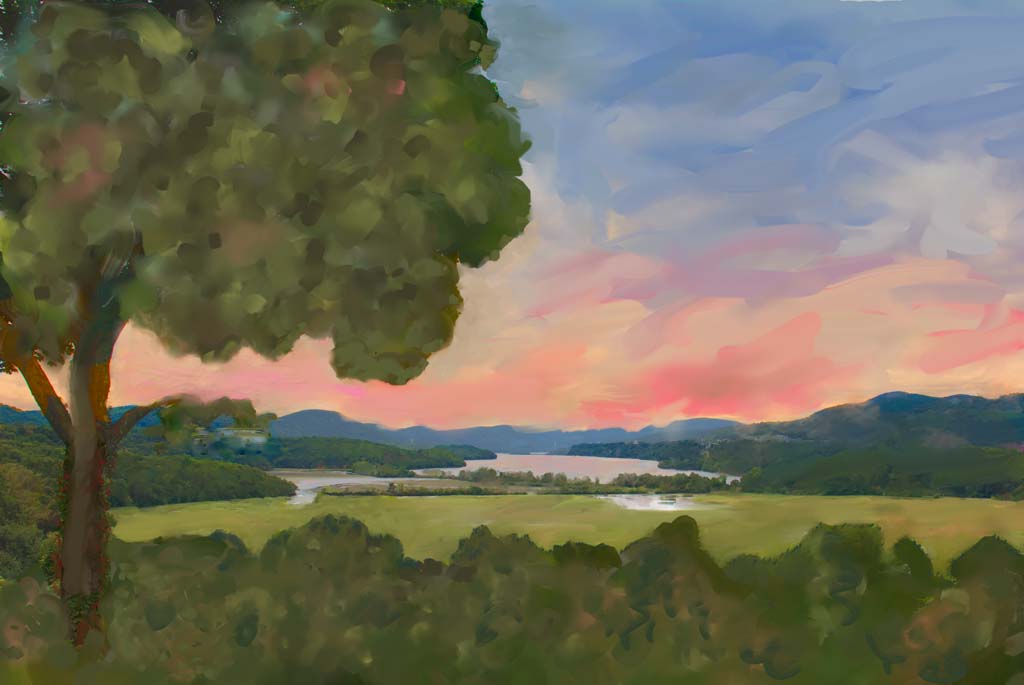 This is a lovely painting and I agree with the comments made by others. The green seems to be from foliage in the background and doesn't seem to belong to tree. I think a one or two pixel feather would remove the cut-out look. There are some strange black swiggles on the right side of the pink cloud that you might want to remove. But still, it's a beautiful renditionob of the amazing tree. |