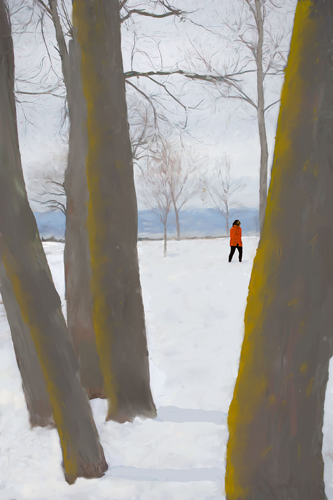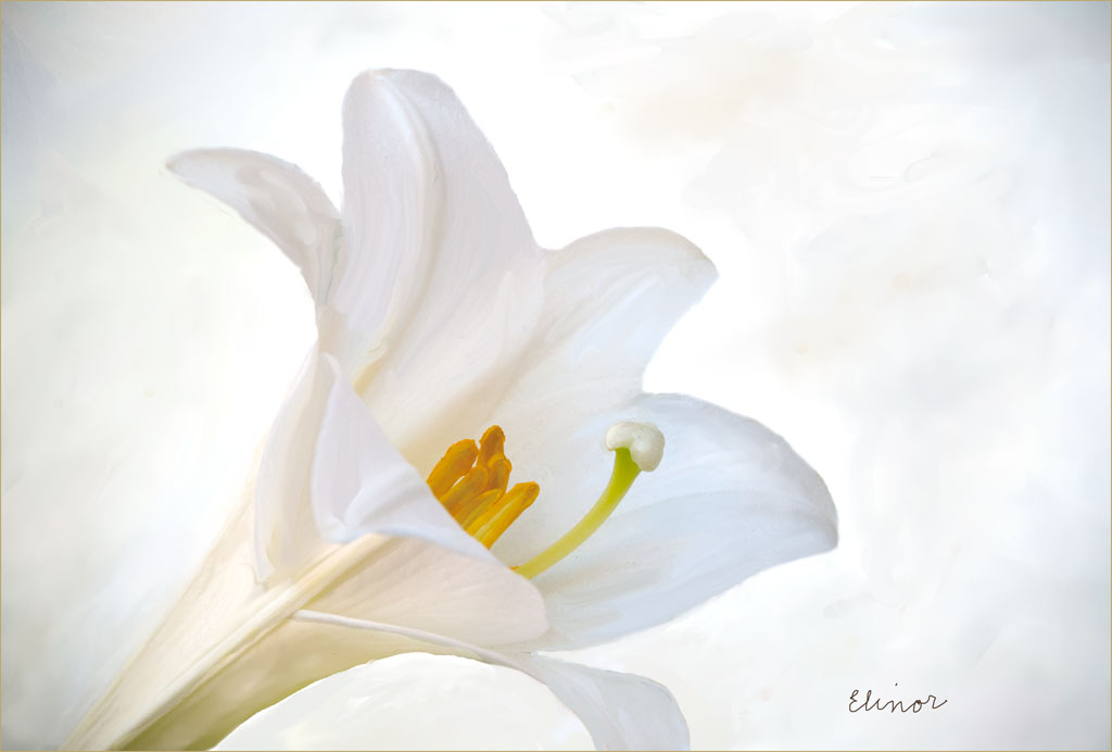 I am intrigued and challenged by making a basically white-on-white, high-key painting. I cropped and did some basic enhancements in Photoshop before opening the photo in Corel Painter. I worked with several of the painting brushes as well as blender brushes. I'm trying to learn how to use Painter and I welcome any help you artists can give me. |