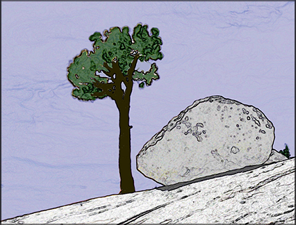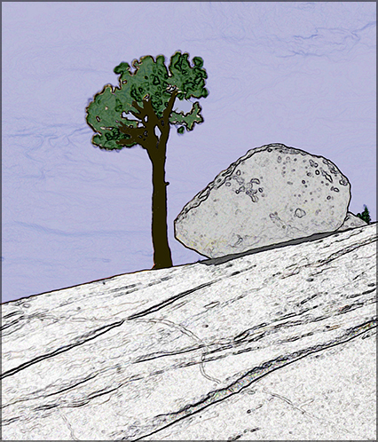 Barrie, I like the graphic simplicity of your image created by the posterize effect. The line drawing result is quite appealing. I wonder if it would work better with fewer elements in the picture; perhaps the foreground glacier, the tree and the larger boulder. I have taken the liberty of attaching a cropped version to give a flavour of what I mean. |