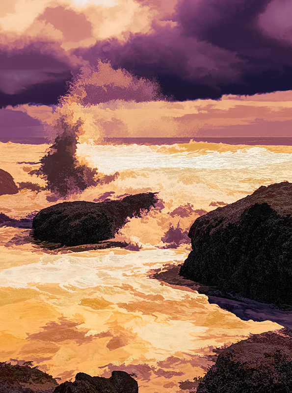 Charles, Given that you are travelling the perimeter of the United States, which is a mammoth task in itself, I hope you are keeping yourselves safe and well during this pandemic. Your colour palette is well chosen as it has created the illusion of a cauldron sea of hot, flowing, molten lava. It reminds me of my childhood when I would have a canvas to 'Paint by Numbers'. The essence of the picture for me is the spray of water in the top left quadrant which seems to be spiralling upwards into the heavens. The patch of bright sky top left is a little distracting and draws the eye. Also, I wanted the horizon line to be a little less central in the frame. I have taken the liberty of applying a slight Crop to the image to show what I mean. |