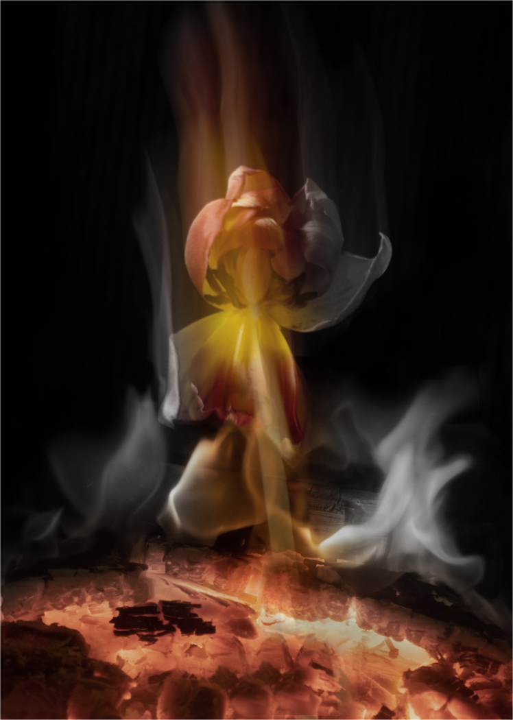 Hazel, I like the way that you used ICM to capture the image of the tulip and then saw something more than the tulip in the end result. You created a visual story in your mind's eye and decided to incorporate an element of fire into the composite. I like your original image which creates the illusion of the tulip plunging downwards out of the heavens. Inclusion of the fire has created a further illusion of the tulip returning from space and re-entering the earth's atmosphere. This got me thinking about playing around with removing some of the colour to enhance the overall visual aesthetic. I have attached two examples below. |