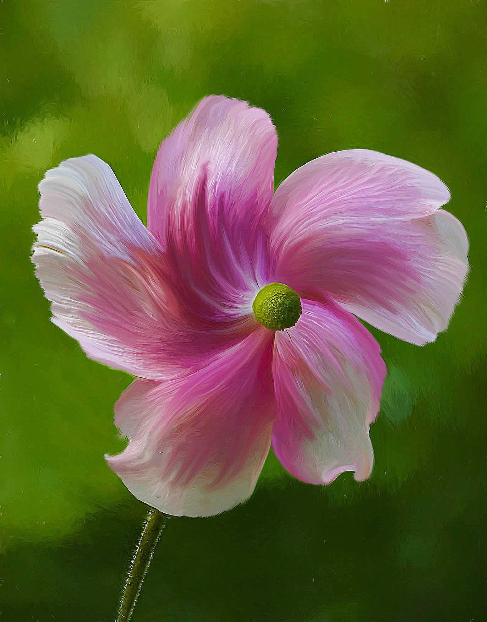 Lisa, This is a delightful image of the anemone which has wonderful romantic overtones. Your use of the Oil Paint and Liquify Filters, of which I am a fan, have added a lovely artistic feeling. The limited colour palette works well as does the shallow depth of field and the soft-focus background. Images do not have to be presented in the same orientation in which they were taken; sometimes, they work as well if not better when flipped horizontally. In this case, I prefer to see the stem of the flower originating from the lower left-hand corner which enhances the left-to-right visual flow through the image. In the image below, I have done that which has created the illusion of the flower being like a rotating propellor and the central part of the flower being projected outwards from the petals. I have also sharpened the image which has reinforced the filter effects you have used. |