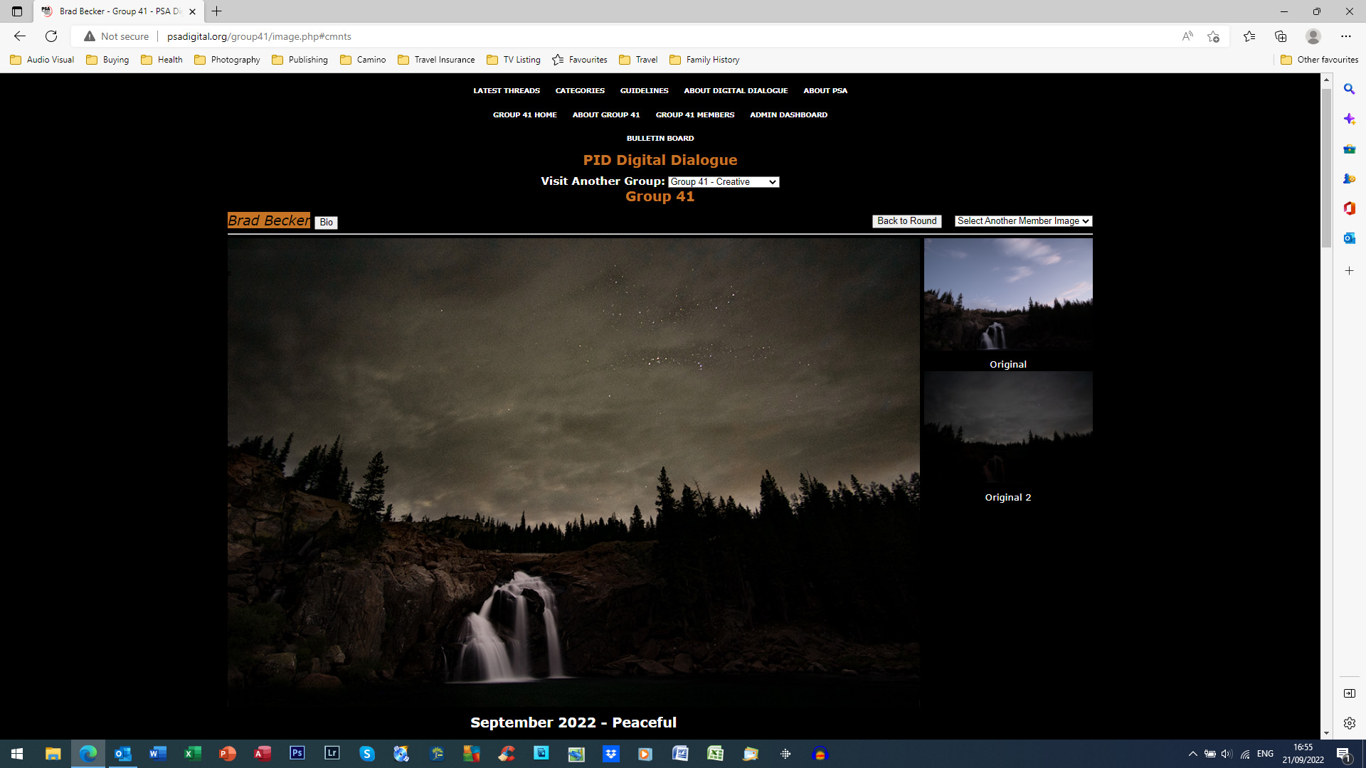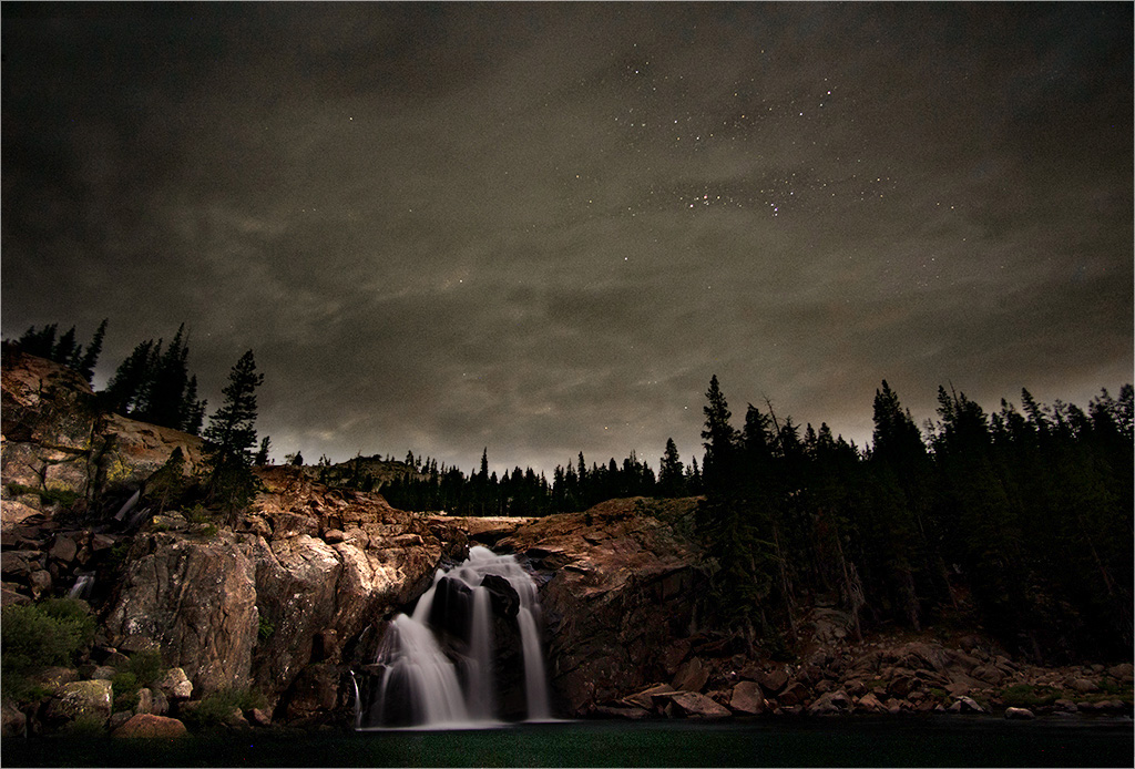 Brad, Thank you for your kind welcome to the group and I look forward to many exchanges of views and healthy debate with other like-minded creative photographers. I like your rationale to combine two images taken two hours apart to produce an atmospheric and magical composite. I can imagine your chagrin when the lady decided to take a bath at 9:45 and pitched her tent right in front of that wonderful view. At that point, your pre-visualisation of capturing star trails was doomed. Although this was a night-shot, I felt that the overall feeling was a little dark to realize its full potential. Compositionally, I like the off-centre position of the waterfall, which adds to the overall visual dynamic of the picture, and the sombre, dark sky. However, I wanted to see more of the detail in the rocky foreground which would create more of a visual tension within the landscape. I hope you don't mind but I have taken the liberty to lighten some of the foreground, leaving the sky and waterfall. I have also stroked a one pixel white line at Opacity 50% around the image as some of the darker areas are bleeding into the background. Unfortunately, this doesn't show up on the image below. |