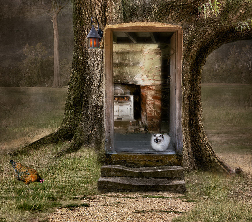 Nadia, It is readily apparent from this image that you have a good Photoshop technical skill base and are au fait with using the various techniques available. I like your pre-visualisation about creating the entrance to a tree house. Compositionally, the pathway provides a good diagonal lead-in line from the bottom left-hand corner towards the doorway. I would be inclined to move the cat to the other side of the doorway as that would provide a good visual counterpoint with the cooker in the background. Not sure whether we need both chickens; I would be inclined to remove the one on the right as it is looking out of the picture and taken the viewer with it. I agree with the others about the shallow depth-of-field into the house. I wondered whether this could be increased by applying a touch of Radial Zoom Blur beyond the cat and into the room. The image below gives a flavour of what I am suggesting. |